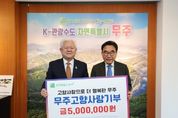 한국현대미술신문 기자 | DH그룹(동해금속(주), 나봄리조트 등) 서동해 회장이 지난 24일 무주군에 고향사랑기부금 5백만 원을 기탁했다. 이날 서동해 회장은 "무주군은 나봄리조트를 통해 소중한 인연을 이어가고 있는 곳”이라며 “무주군과의 상생을 위해 앞으로도 세심한 관심을 쏟을 것”이라고 밝혔다. 전북 완주군에 본사를 둔 DH그룹은 주력 사업인 상용차 및 승용차 부품 생산 분야에서 ‘작지만 강한 기업’으로서의 입지를 확고히 하고 있으며 무주군 설천면에서는 나봄리조트를 운영하고 있다. 봉사 경영을 통한 사회 환원에도 적극적인 것으로도 알려진 DH그룹은 2008년에 설립된 '권정순 장학재단'을 통해 저소득층 지원, 청소년 장학사업, 소외된 이웃돕기 등 사회공헌 활동에 연간 3억여 원을 투입하고 있다. 무주군에는 2023년부터 3년간 총 1천1백만 원의 고향사랑기부금을 기탁해 훈훈함을 전하고 있다.