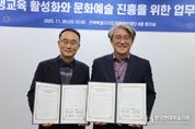 한국현대미술신문 기자 | 전북특별자치도평생교육장학진흥원과 전북특별자치도문화관광재단은 11월 26일, 전북문화관광재단 회의실에서 평생학습과 문화예술 분야의 공동 발전을 목표로 업무협약(MOU)을 체결했다. 본 협약은 양 기관이 상호 협력체계를 구축하여 평생학습사회 구현과 문화예술 진흥, 나아가 문화복지의 확산을 함께 도모함으로써 전북도민의 삶의 질을 높이고 지역의 지속 가능한 학습생태계를 조성하는 데 그 목적이 있다. 주요 협약 내용으로는 ▲문화예술 기반 평생학습 프로그램 공동 개발 및 운영 ▲인적·물적 자원의 상호 활용 및 협력 사업 발굴 ▲세미나·포럼 등 공동 연구 및 정책 협력 등이다. 이현웅 전북특별자치도평생교육장학진흥원장은 “이번 업무협약은 도민의 삶 속에서 평생교육과 문화예술이 자연스럽게 연결되는 기반을 마련하는 중요한 발걸음”이라며, “도 출연기관 간 협력을 통해 시너지 효과를 극대화하고, 도민 모두가 누릴 수 있는 학습·문화 환경 확대에 최선을 다하겠다”고 밝혔다. 양 기관은 협약 체결 이후 세부 추진방안을 논의하기 위한 협력 체계를 마련하고, 다양한 함께 추진할 수 있는 다양한 사업