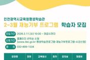 한국현대미술신문 박재남 기자 | 인천광역시교육청평생학습관은 오는 23일부터 ‘재능기부 프로그램’을 운영한다. 이번 프로그램은 시민이 강사로 참여해 자신의 전문성과 경험을 공유하는 참여형 평생학습 활동으로, 매월 새로운 주제의 강좌를 통해 생활 속 배움의 기회를 제공한다. 2월부터 운영되는 강좌는 ‘시니어 요가’, ‘시니어 필라테스’, ‘근력 스트레칭’, ‘나를 닮은 꽃그림’, ‘내 마음속의 논어’ 등 총 5가지이다. 수강 신청은 11일 오전 10시부터 평생학습관 누리집에서 선착순으로 진행되며, 자세한 사항은 누리집의 공지사항을 확인하거나 평생교육부로 문의하면 된다.
