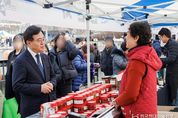 한국현대미술신문 배건 기자 | 진교훈 서울 강서구청장이 5일 마곡광장에서 열린 ‘설맞이 농특산물 직거래장터’를 찾았다. 이날 진 구청장은 장터 내 점포 곳곳을 들려 임실치즈, 밀양딸기 등 지역 농특산물을 직접 구입하고 상인들과 장을 보러 나온 주민들에게 다가가 친근하게 새해 인사를 나눴다. 설맞이 직거래장터는 오는 6일(금)까지 계속된다. 운영시간은 오전 10시부터 오후 6시까지다. 장터에는 임실군, 상주시, 태안군, 강릉시, 여수시, 함안군, 순천시, 정읍시, 괴산군, 완주군, 평창시, 남원시, 밀양시, 청양군, 논산시 등 15개 지자체에서 39개 업체가 참여했으며, 각 지역의 다양한 농특산물을 시중보다 저렴하게 구입할 수 있다. 특히, 장터에선 강서구 특산품인 ‘경복궁 쌀’과 이를 원료로 만든 ‘나루생막걸리’도 함께 선보여 방문객들의 발길을 사로잡았다. 진교훈 구청장은 “장터에 나오셔서 각 지역의 농특산물을 합리적인 가격으로 구매해 보시길 바란다”고 말했다.