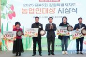 한국현대미술신문 원진 기자 | 강원특별자치도는 강원일보사와 공동으로 11월 4일 오전 11시, 춘천 세종호텔에서 '2025 제45회 강원특별자치도 농업인대상 시상식'을 개최했다. 이날 행사에는 여중협 행정부지사, 박진오 강원일보사장, 김용복 강원특별자치도의회 부의장을 비롯해 도의원, 농업인대상 수상자와 가족, 농협중앙회 강원지역본부장, 도 농업인단체 총연합회장 및 회원 단체장 등 150여 명이 참석했다. 올해로 45회를 맞은 강원특별자치도 농업인대상은 1981년부터 강원특별자치도와 강원일보사가 공동 주최해온 강원 농업 분야의 최고 권위 있는 상으로, 매년 도내 우수 농업인과 농업단체를 선정해 시상하고 있으며, 2024년까지 총 300명이 수상의 영예를 안았다. 이번 시상식에서는 농업·농촌 발전에 기여한 5개 부문 수상자 5명에게 상패가 수여됐다. 부문별 수상자는 △친환경농업부문 영농조합법인 강원유기농, △수출유통부문 농업회사법인 솜씨가㈜, △축산발전부문 김진선, △미래농업육성부문 추경진, △농촌융복합산업부문 해담마을 영농조합법인이다. 아울러 농촌마을활력프로젝트 우수마을로 선정된 4개 마