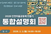 한국현대미술신문 박재남 기자 | 인천광역시는 2월 2일 제물포스마트타운 2층 대강의실에서‘2026년 인천광역시 마을공동체 만들기 통합설명회’를 개최한다고 밝혔다. 이번 설명회는 마을공동체 관계자와 활동가, 일반 시민 등 약 150명이 참석할 예정으로, 인천시와 군·구가 추진하는 마을공동체 공모사업과 주요 지원 정책을 한자리에서 소개해 시민들의 사업 참여를 확대하기 위해 마련됐다. 인천시는 올해 제3기 마을공동체 만들기 기본계획(2026~2030)을 수립하고, ‘시민과 함께, 자치와 연대로 성장하는 인천 마을공동체’를 비전으로 설정했다. 이는 주민이 스스로 의제를 발굴하고 실행하는 자치와 공동체 간 상생과 연대를 통해 마을공동체가 단발성 사업을 넘어 시민의 삶과 도시문화 속에 지속적으로 자리 잡도록 하겠다는 취지를 담고 있다. 설명회 1부에서는 인천시가 직접 기획해 추진하는 ▲네트워크 활성화 ▲마을 홍보 ▲세대 공감 ▲마을길 잇기 ▲기타 주민제안 등 5개 유형의 기획 공모사업을 소개한다. 이와 함께 마을지원활동가 운영, 교육, 공론장, 성과공유회 등 마을공동체의 성장을 지원하는 주요 프로