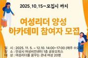 한국현대미술신문 배윤섭 기자 | 안성시는 지역사회 발전을 이끌 열정있고 능력있는 여성 지도자를 발굴·육성하기 위해 ‘2025년 안성시 여성리더 양성 아카데미’ 기본과정 교육 참가자를 모집한다. 이번 아카데미는 적극적으로 참여할 수 있는 여성 시민 누구나 신청할 수 있으며, 신청기간은 오는 10월 15일부터 시작된다. 교육은 11월 5일부터 12월 10일까지 6주간 매주 수요일에 안성시여성비전센터 (발화대길 25) 1층 공유오피스에서 진행 될 계획이다. 교육 내용은 ‘나는 당신이 행복했으면 좋겠습니다.’ 라는 주제로 김경희 강사의 행복소통 리더십 강의로 개강식을 열고 2~3주차는 감성을 담아 나를 알리는 SNS 활용법 이론편과 실습편, 4~5주차에는 나만의 비서 만들기 챗봇과 생성형 AI교육 이론편과 실습편을 구성하여 최신 트렌드에 맞춘 리더 역량 강화를 위한 강의들로 구성했으며 6주차에는 퍼실리테이션 기법을 활용하여 지역 내 현안 문제를 파악하고 리더로서 해결 방법을 제시하는 과정을 마지막으로 수료식을 가질 예정이다.