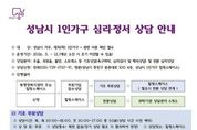 한국현대미술신문 배윤섭 기자 | 성남시는 우울감이나 외로움, 불안감, 스트레스로 어려움을 겪는 1인 가구에 전문적인 심리·정서 상담을 지원한다고 5일 밝혔다. 이를 위해 최근 공모로 선정한 6곳 전문상담센터와 1인 가구 심리·정서 상담 수행에 관한 업무 협약을 했다. 협약한 상담센터는 △엠브레스 마인드 심리상담센터(분당구 구미동 소재) △온새미 심리상담센터(분당구 금곡동) △심리상담연구소 사람과 사람 위례점(수정구 창곡동) △㈜분당심리상담센터 아이엠미(분당구 야탑동) △속편한 심리상담센터(수정구 창곡동) △㈜마음꼭 차심리상담센터(분당구 야탑동)다. 이들 전문상담센터 이용 신청은 성남시 1인가구 힐링 스페이스(중원구 둔촌대로 100, 4층, ☏031-729-1756~9)나 거주지 동 행정복지센터 등에서 하면 된다. 성남시는 전문상담센터에서의 1인 가구 심리·정서 상담 지원을 위해 올해 5000만원의 사업비를 투입한다. 상담 지원 횟수는 최대 12회다. 1~8회 상담은 성남시가 비용(회당 4만~6만원)을 지원해 무료다. 나머지 9~12회 상담은 비용의 10%(400