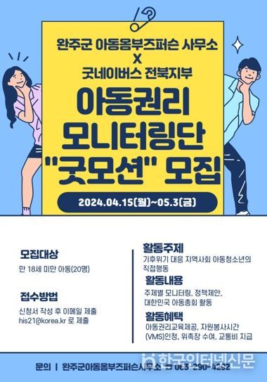 모니터링단 운영은 완주군 아동옴부즈퍼슨사무소와 아동권리보호 전문기관인 굿네이버스 전북지부가 협력해 맡는다.