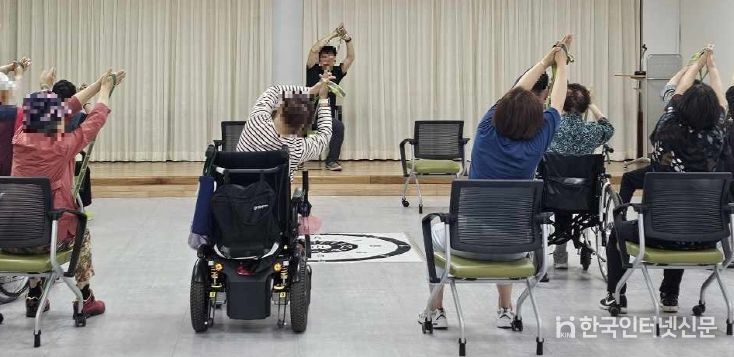이번 교육은 보행이 불편한 장애인에게 발생할 수 있는 낙상사고 위험을 감소시키기 위해 근력 강화 균형 조절 능력을 향상시켜 삶의 활력을 제공하고자 마련됐으며, 낙상으로 인한 2차 장애 예방교육과 더불어 △하지 관리 운동 및 유산소 운동 △호흡 훈련을 통해 활동의 기본 갖추기 △밴드 활용 체간 근력 강화 재활 체조 등으로 진행됐다.