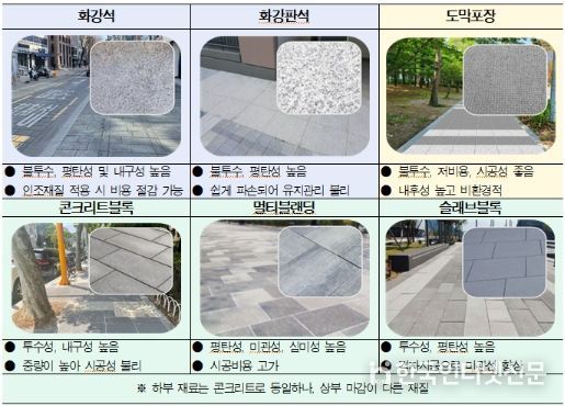기본적으로 보도블록포장 재질은 빗물 흡수와 물고임을 막고 열섬현상을 완화할 수 있는 투수성 재질을 우선 사용한다. 역사성을 간직한 행주산성, 서오릉 일원에는 주변 경관과 어우러지는 화강석과 화강판석을 함께 사용하고, 특화가로 조성이 필요한 지역에는 맞춤형 별도 재질을 사용한다.