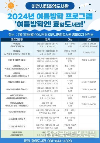 한국현대미술신문 배윤섭 기자 | 이천시 효양도서관은 2024년 7월 27일부터 유아와 초등학생을 대상으로 여름방학 프로그램 '여름방학엔 효양도서관!'과 여름 독서교실을 운영한다.