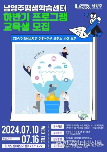한국현대미술신문 배윤섭 기자 | 남양주시는 2024년 하반기 평생학습센터 강좌 90개를 개설하고, 오는 10일부터 22일까지 교육생 1,323명을 모집한다고 9일 밝혔다.