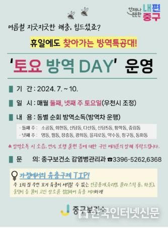 특히, 말라리아, 일본뇌염 등 모기를 매개로 한 감염병의 확산이 우려되는 가운데, 중구는 문자 한 통으로도 ‘찾아가는 방역특공대’를 확대하여 월 2회 둘째, 넷째 토요일을 ‘토요 방역 데이(DAY)’로 지정하고 동별로 순회하며 방역을 실시한다. 토요일 방역은 지난 7월 27일을 시작으로 10월까지 운영할 예정이다.