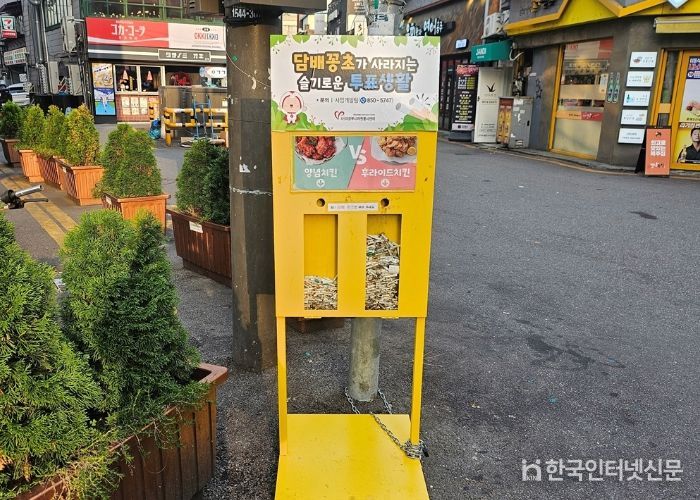 담배꽁초 투표함은 주점, 음식점 등이 밀집되어 있고 유동인구가 많은 지역에 설치됐으며, 흡연 후 무단투기를 줄여보고자 시행하게 됐다. 이용자들의 흥미를 유발하고자 밸런스 게임으로 주제를 제시하고 투표하도록 유도하고 있으며 자원봉사단체와 연계하여 주기적으로 투표함 및 인근 담배꽁초 수거 활동을 진행하고 있다.