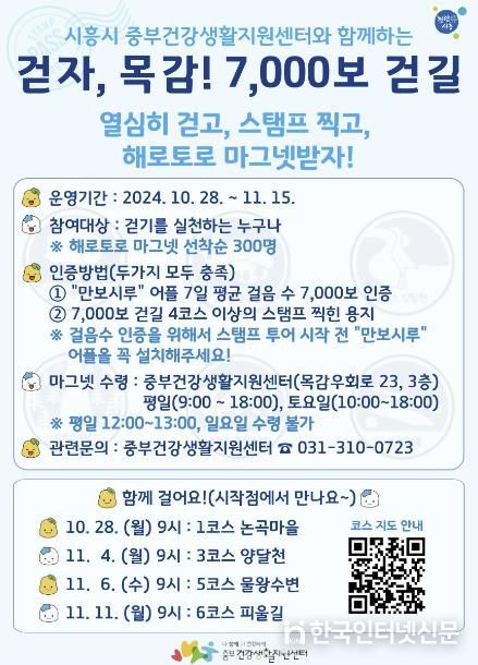 한국현대미술신문 배윤섭 기자 | 시흥시 중부건강생활지원센터는 시민들의 걷기 생활을 장려하고, 지역 내 걷기 좋은 코스를 홍보하기 위해 ‘걷자, 목감! 7천 보 걷길’ 스탬프 투어를 10월 28일부터 11월 15일까지 3주간 진행한다.