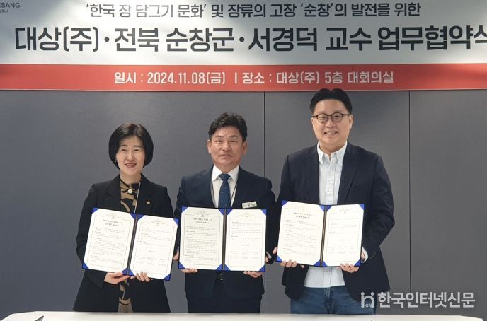 한국현대미술신문 강경숙 기자 | 순창군이 ‘한국의 장 담그기 문화’의 유네스코 인류무형문화유산 최종 등재를 기원하며, 대상(주)과 서경덕 교수와 함께 순창군 전통 장 문화 홍보를 위한 3자 간 업무협약을 체결했다고 8일 밝혔다.