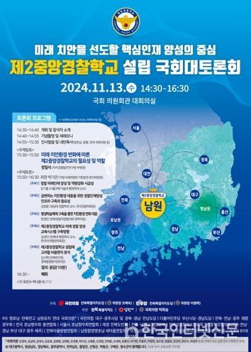한국현대미술신문 강경숙 기자 | ‘제2중앙경찰학교’ 유치 경쟁이 치열한 가운데 남원시가 13일 국민의힘 ‧ 더불어민주당 전북특별자치도당, 국회의원 박희승, 전북특별자치도와 함께 영호남 공동기획 '제2중앙경찰학교 설립을 위한 국회 대토론회'를 개최한다.