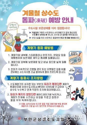 부안군은 각 가정이 겨울철 수도계량기 동파로 인한 불편을 겪지 않도록 ‘겨울철 상수도 동파 예방법’에 대한 홍보물을 제작하여 군 홈페이지, 부안톡톡, 읍·면사무소 등을 통해 홍보하고 있으며 공동주택 등에 동파 방지용 보온재를 지급계획임을 말했다.