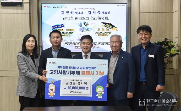 한국현대미술신문 강경숙 기자 | 김제시는 김진원씨와 아들 김서욱씨가 14일 고향사랑기부금 1,000만원, 김제사랑장학금 1,000만원을 기부했다고 밝혔다.