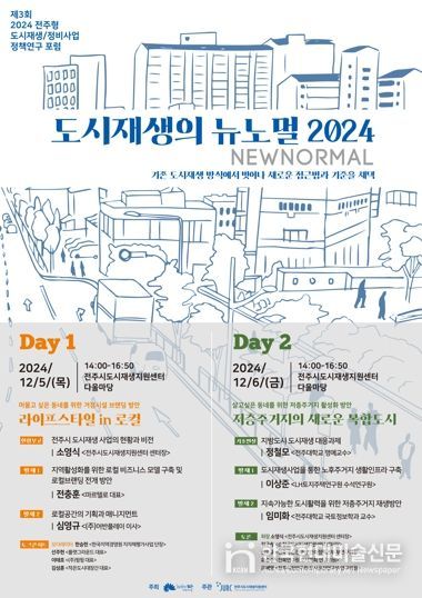 둘째 날인 오는 6일에는 정철모 전주대학교 명예교수가 ‘지방도시 도시재생 대응과제’를 주제로 기조연설에 나서며, 이어 이상준 LH토지주택연구원 수석연구원과 임미화 전주대학교 국토정보학과 교수가 각각 ‘도시재생사업을 통한 노후주거지 생활인프라 구축’과 ‘지속가능한 도시활력을 위한 저층주거지 재생방안’을 주제로 발제에 나선다.