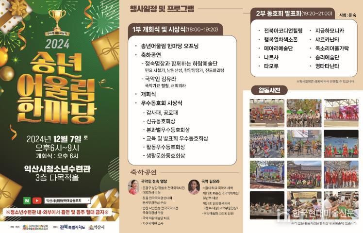 익산시는 ㈔익산시생활문화예술동호회가 오는 7일 오후 6시 익산시청소년수련관에서 '송년어울림 한마당'을 개최한다고 4일 밝혔다.