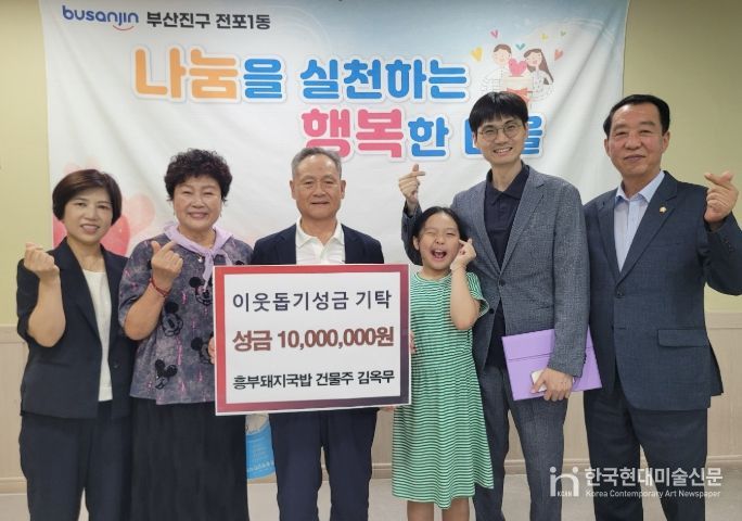한국현대미술신문 정소영 기자 | 부산진구 전포1동에 소재한 흥부돼지국밥(전포대로200번길 24) 건물주 김옥무님이 8월 26일, 어려운 이웃을 위해 써달라며 성금 1,000만 원을 전포1동주민센터에 기탁했다.