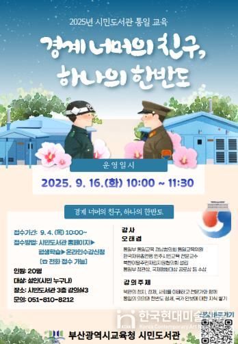 한국현대미술신문 정소영 기자 | 부산광역시립시민도서관은 오는 16일 시민도서관 강의실 3에서 성인 20명을 대상으로 통일 교육 프로그램 ‘경계 너머의 친구, 하나의 한반도’를 운영한다.