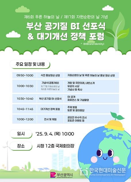 한국현대미술신문 정소영 기자 | 부산시는 '제17회 자원순환의 날(9월 6일)'과 '제6회 푸른 하늘의 날(9월 7일)'을 기념해 오늘(4일) 공동 기념식을 개최한다고 밝혔다.