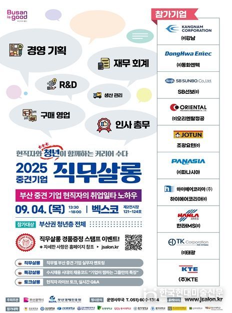 한국현대미술신문 정소영 기자 | 부산시는 오늘(4일) 오후 1시 30분부터 벡스코 제2전시장 121~124호에서 '2025 부산 중견기업 직무박람회 '직무살롱 : 청년과 현직자가 함께하는 커리어수다''를 개최한다고 밝혔다.