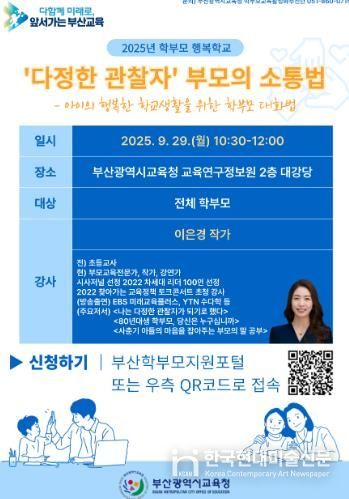 한국현대미술신문 정소영 기자 | 부산광역시교육청은 학부모의 올바른 자녀 교육관 정립과 부산교육 정책 이해를 돕기 위해 ‘9월 학부모 행복학교’를 운영한다고 밝혔다.
