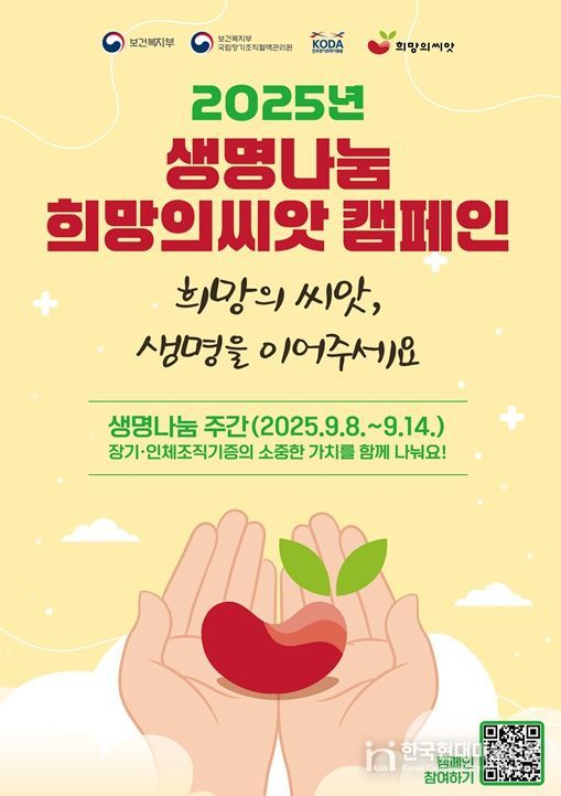 한국현대미술신문 정소영 기자 | 부산시는 제8회 생명나눔 주간(9.8.~9.14.)을 맞아 '생명나눔 희망의씨앗 캠페인'을 실시한다고 밝혔다.