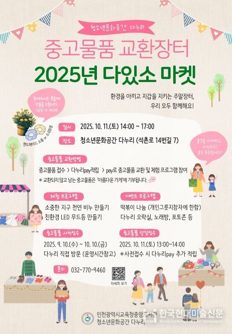 한국현대미술신문 박재남 기자 | 인천광역시교육청중앙도서관 청소년문화공간 다누리는 기후 위기 대응과 자원 재사용을 실천하는 중고물품 교환장터 ‘2025년 다있소마켓’을 운영한다.