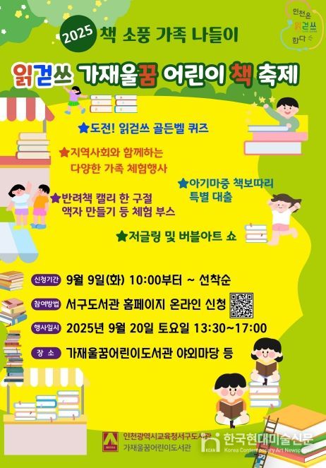 한국현대미술신문 박재남 기자 | 인천광역시교육청서구도서관은 오는 9월 20일 오후 1시 30분, 가재울꿈어린이도서관 야외무대에서 ‘2025 읽걷쓰 가재울꿈 어린이 책 축제’를 개최한다.