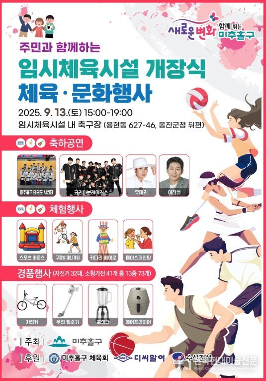 한국현대미술신문 박재남 기자 | 인천 미추홀구는 오는 13일 용현동 627-46 부지에 조성된 임시체육시설에서 개장 기념 체육문화 행사를 개최한다.