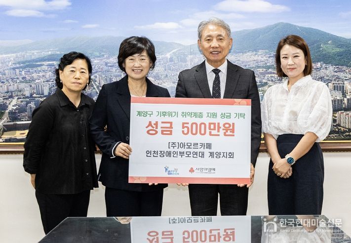 한국현대미술신문 박재남 기자 | 인천광역시 계양구는 9일 ㈜아모르카페 인천장애인부모연대 계양지회가 기후위기 영향으로 어려움을 겪는 저소득·취약계층 지원을 위해 성금 500만 원을 기탁했다고 밝혔다.