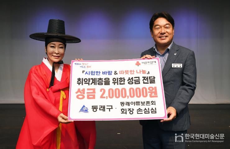 한국현대미술신문 정소영 기자 | 부산 동래구는 지난 7일 제60주년 동래야류 정기발표공연‘2025 동래들놀음 축제’행사장에서 동래야류보존회 손심심 회장으로부터 어려운 문화예술인을 돕기 위한 이웃돕기 성금 200만 원을 전달받았다고 밝혔다.