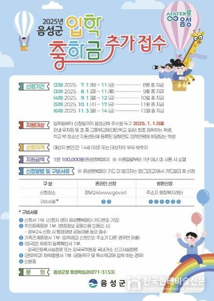 한국현대미술신문 신정은 기자 | 음성군은 2025년도 입학축하금 지원사업의 하반기 추가 신청을 9월부터 11월까지 매월 초순(약 2주간) 접수한다고 밝혔다.