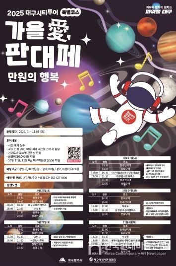 한국현대미술신문 정소영 기자 | 대구광역시는 가을 정취를 만끽할 수 있는 대구 대표 축제 ‘판타지아대구페스타’와 연계한 시티투어 특별노선 ‘가을 愛, 판대페 만원의 행복’을 9월 27일부터 11월 8일까지 총 5회에 걸쳐 운영한다.