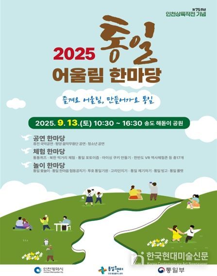한국현대미술신문 박재남 기자 | 인천광역시는 오는 9월 13일 오전 10시 30분부터 오후 4시 30분까지 송도 해돋이공원 잔디광장에서‘2025년 통일어울림 한마당’을 개최한다고 밝혔다.