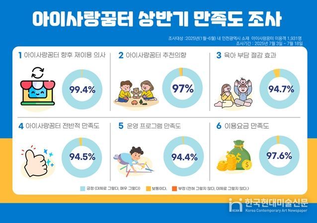 이번 조사는 인천시 소재 아이사랑꿈터를 이용한 1,931명을 대상으로 7월 3일부터 7월 18일까지 진행됐으며, 향후 재이용 의사, 추천의향, 육아 부담 경감 효과, 전반적 만족도, 운영 프로그램 만족도, 이용요금 만족도 등 주요 항목에서 높은 만족도를 보였다.