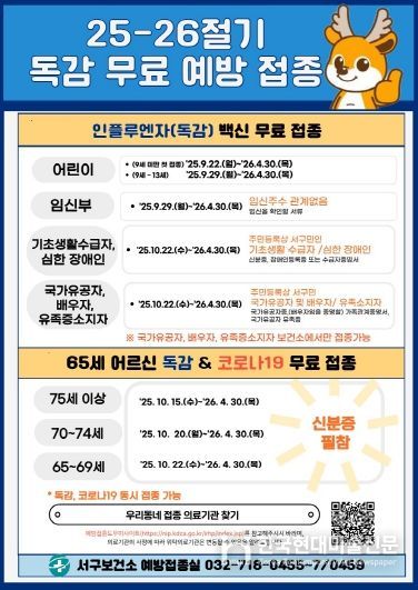 한국현대미술신문 박재남 기자 | 인천 서구는 오는 9월 22일부터 2025~2026절기 인플루엔자(독감) 무료 예방접종을 실시한다고 9일 밝혔다.