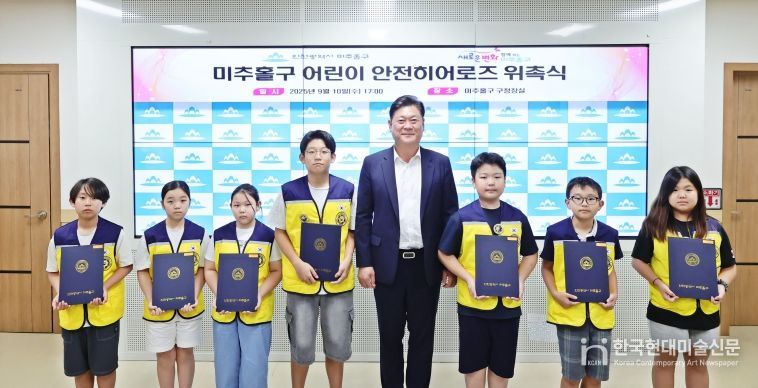 한국현대미술신문 박재남 기자 | 인천 미추홀구는 지난 10일 구청장실에서 ‘2025 어린이 안전 히어로즈’ 위촉식을 열고, 신규 위촉된 어린이 7명에게 위촉장과 활동 조끼, 배지 등을 전달했다.
