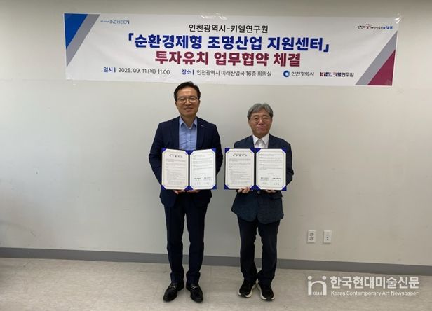 한국현대미술신문 박재남 기자 | 인천광역시는 9월 11일 조명기술 분야 국내 최고 전문기관인 키엘연구원과 ‘순환경제형 조명산업 지원센터’ 설립을 위한 투자유치 협약을 체결했다고 밝혔다.