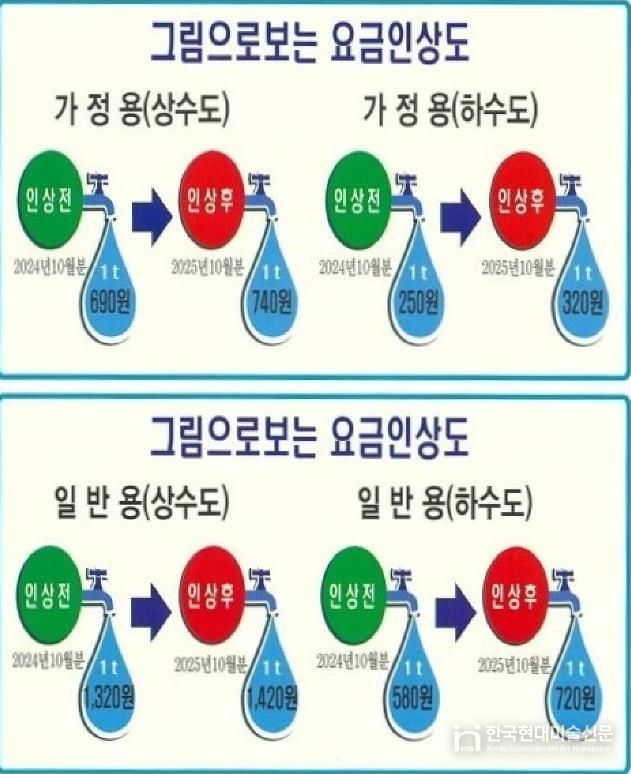 가정용 기준 상수도 요금은 톤당 690원에서 740원으로 50원 인상되고, 하수도 요금은 톤당 250원에서 320원으로 70원 인상된다.