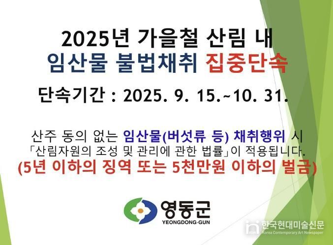 한국현대미술신문 신정은 기자 | 충북 영동군은 본격적인 가을철 임산물 채취 성수기를 맞아 오는 15일부터 산림 내 불법 행위에 대한 집중 단속을 실시한다고 12일 밝혔다.