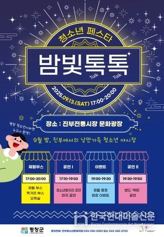 한국현대미술신문 원진 기자 | 평창군은 오는 9월 13일 오후 5시부터 8시까지 진부면 전통시장 문화 광장에서 ‘밤빛 톡톡(Talk Talk) 청소년 페스타’를 개최한다.