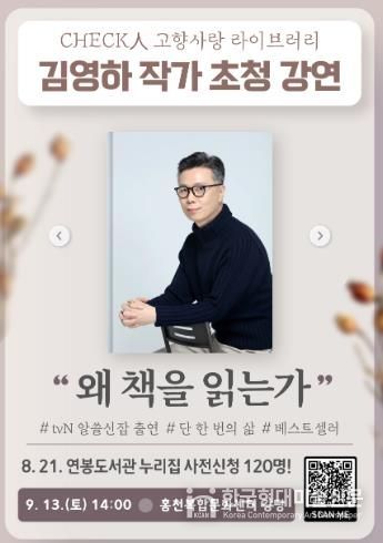 한국현대미술신문 원진 기자 | 홍천군립도서관은 9월 13일 오후 2시 홍천복합문화센터 1층 강당에서 김영하 작가를 초청하여 체크인 고향사랑 라이브러리 네 번째 강연을 개최한다.