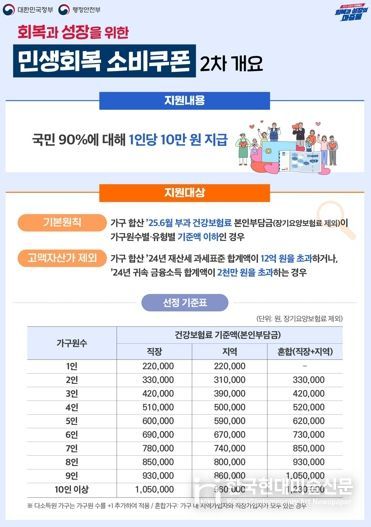 2차 민생회복 소비쿠폰은 1인당 10만원씩 지급될 예정이며, 2025년 6월 부과 본인부담 건강보험료 가구별 합산액이 선정기준 이하인 경우 지급대상자가 된다. 가구원의 2024년 재산세 과세표준 합계액이 12억원을 초과하거나, 2024년 귀속 금융소득 합계액이 2천만 원을 초과하는 경우 해당 가구의 가구원 모두가 지급 대상에서 제외된다.