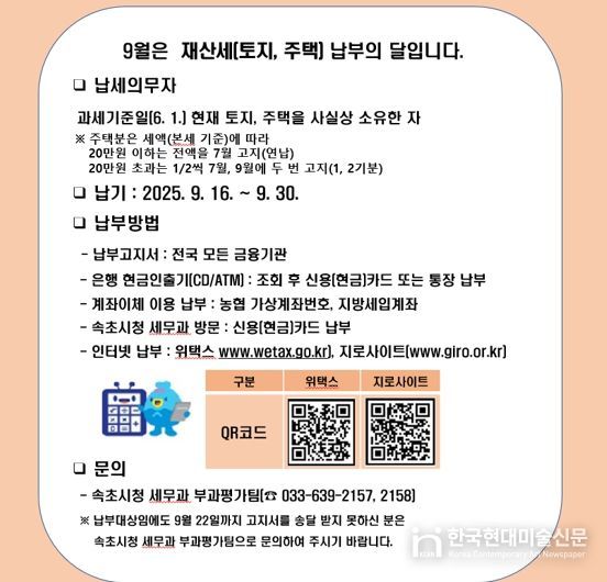 한국현대미술신문 원진 기자 | 속초시는 2025년 6월 1일 기준 관내 토지 및 주택 소유자를 대상으로 2025년도 9월 정기분 재산세 40,894건, 총 125억 7,200만 원을 부과했다.