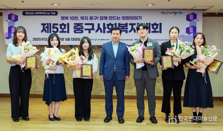 한국현대미술신문 정소영 기자 | 대구 중구는 12일 구청 대강당에서 제26회 사회복지의 날(9월 7일)과 사회복지주간을 기념해 사회복지 증진에 이바지한 종사자들의 노고를 격려하고, 2026년 시행 예정인 통합돌봄사업의 성공적 추진을 위한 ‘제5회 중구사회복지대회 및 통합돌봄 민관협력 세미나’를 개최했다.