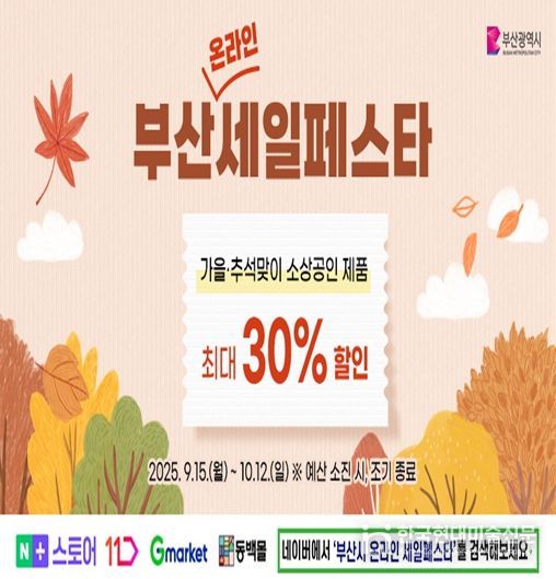 한국현대미술신문 정소영 기자 | 부산시는 15일부터 10월 12일까지 약 한 달간 민족 대명절 추석을 맞아 '가을 추석맞이 부산세일페스타(온라인) 특별 할인전'을 진행한다고 밝혔다.