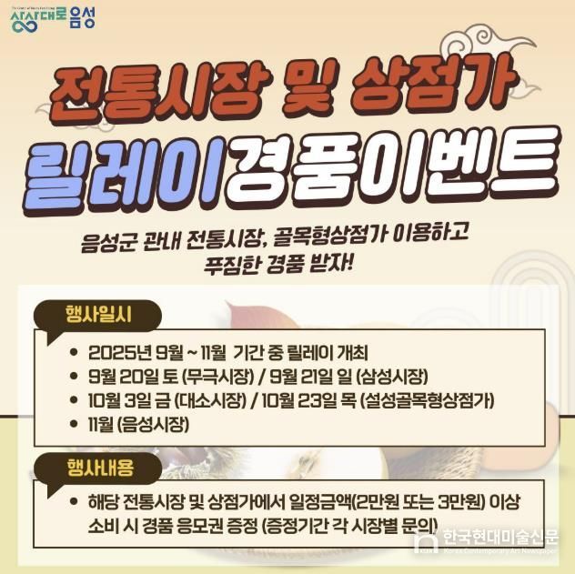 한국현대미술신문 신정은 기자 | 음성군에서 물가 상승 및 경기침체로 어려움을 겪고 있는 관내 전통시장 및 골목형상점가 활성화를 위한 소비 촉진 릴레이 경품이벤트 행사가 9월부터 11월까지 펼쳐진다.