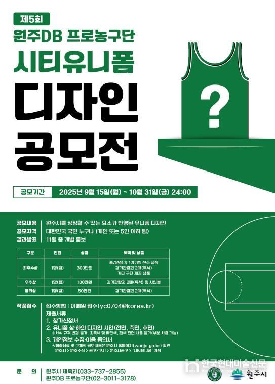 한국현대미술신문 원진 기자 | 원주시는 원주DB 프로농구단과 함께 시 브랜드를 홍보하고, 연고지에 대한 애착을 강화하고자 전 국민을 대상으로 제5회 시티유니폼 공모전을 실시한다.